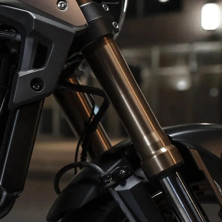 A CB 650R possui suspensão invertida do tipo Separate Function Front Fork(SFF) e amortecedor com estrutura Big Piston Front Fork(BPF), conjunto este que reduz o peso não-suspenso da motocicleta. Além de firmeza e respostas mais precisas, você tem mais estabilidade durante a pilotagem.