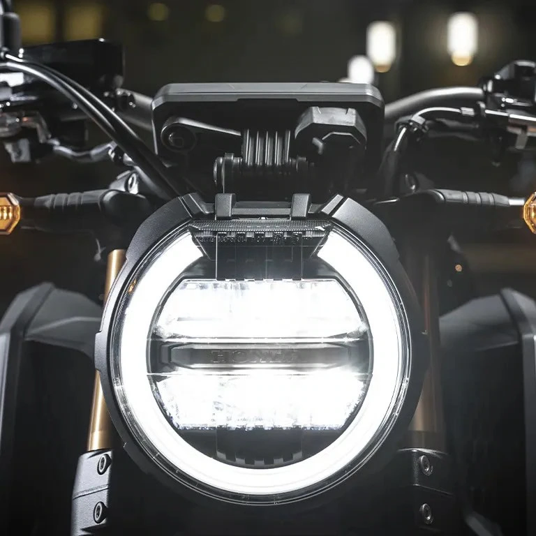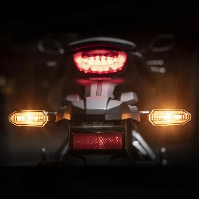 O conjunto óptico apresenta luzes de direção na clássica cor âmbar e um farol semicircular característico da linha Neo Sports Café, composto pelo sistema Daytime Running Light (DRL) e pelo bloco óptico bipartido em LED com os faróis alto e baixo. Complementando o conjunto, uma lanterna em meia-lua assina o autêntico design.