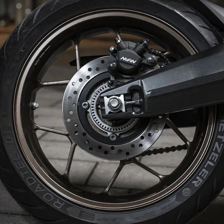 Também dotado de tecnologia ABS, o freio traseiro é composto por disco de cáliper de pinça simples e oferece alto controle de frenagem.